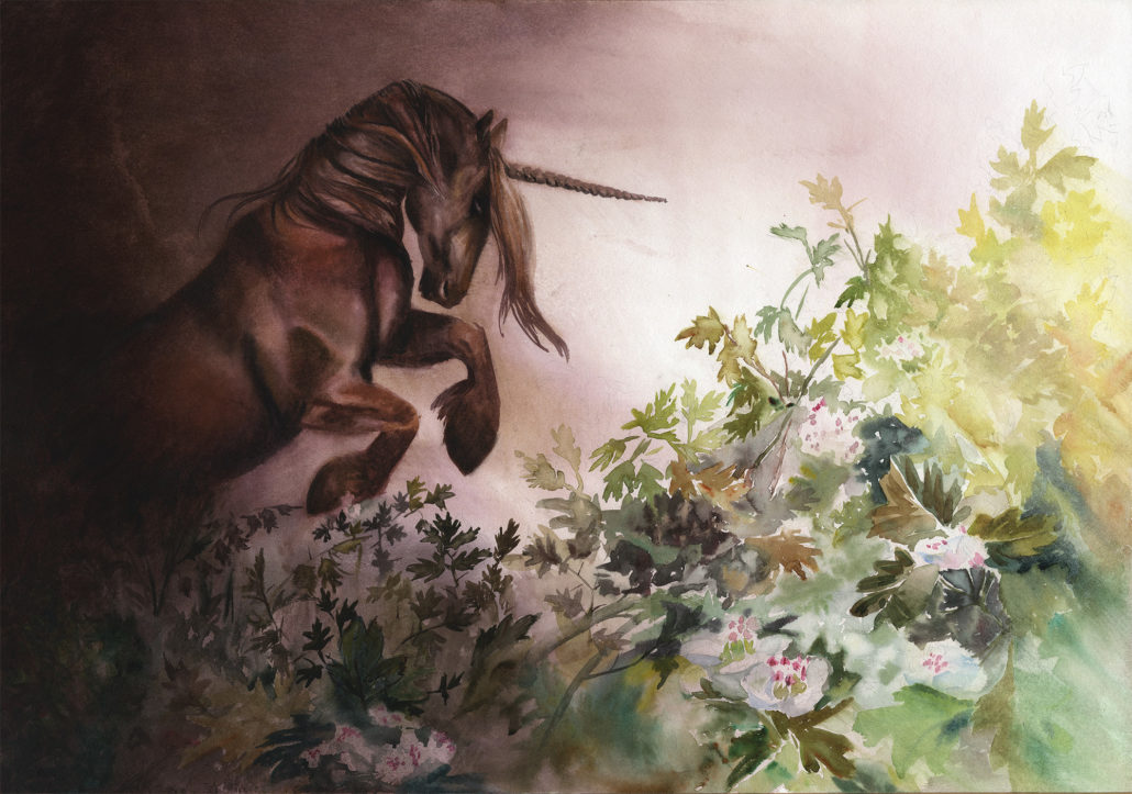 Aquarelle publiée dans Oghams II, Les Portes d’Or, liée au symbole de l’ogham de l’Aubépine (Huath). La publication a été volontairement contrastée pour donner le sentiment de passer de l’ombre à la lumière.