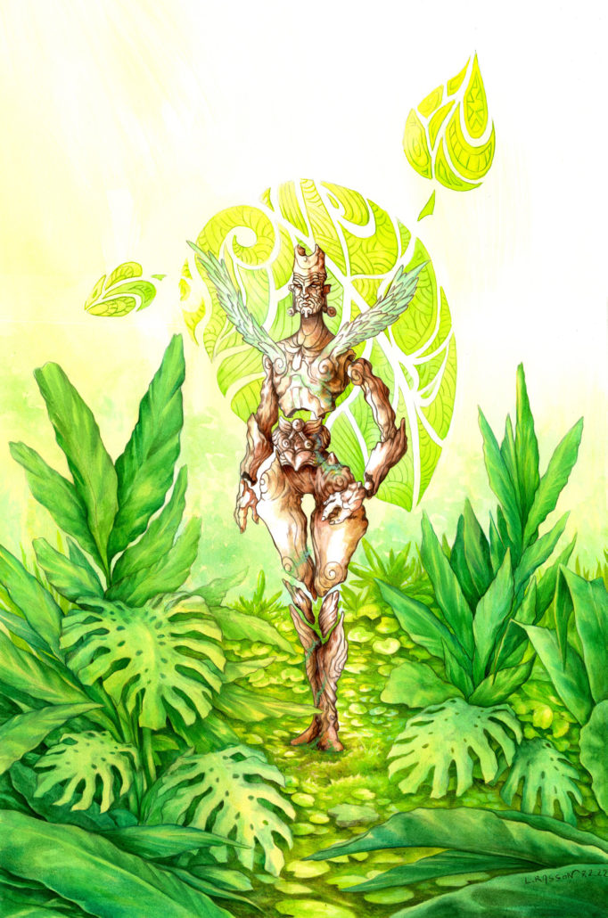 Lors de la séparation des deux corps amoureux, les enfants dieux découvrirent l’humanité qui, en ce temps reculé, était immortelle. Tāne Mahuta est donc le révélateur et le créateur du monde tel que nous le connaissons. (Caroline Duban)