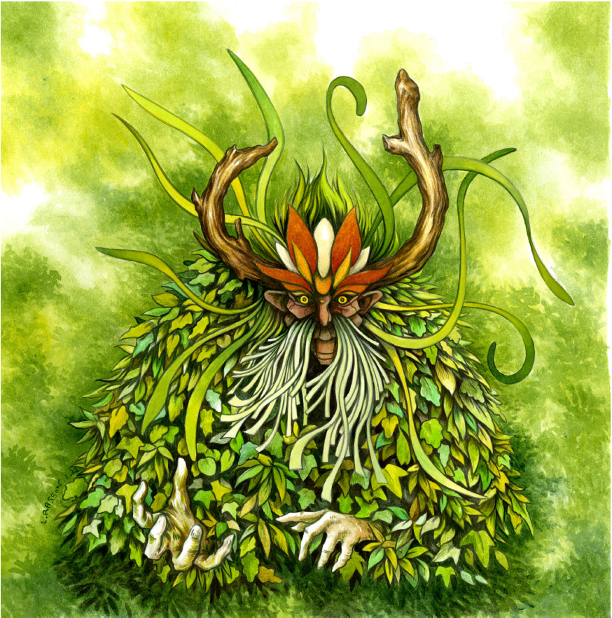 L’Homme Vert, ou The Green Man, est la représentation de l’Esprit de la Forêt, une divinité très ancienne, très probablement associée au culte de la fertilité, dont l’origine se perd dans le temps. Cette personnification a souvent été modelée sur les chapiteaux des églises romanes, considérée comme un héritage païen, peut-être celtique. Son visage, couvert de mousses et de feuillages, est porteur des cycles saisonniers. Plus rarement trouvons-nous sa parèdre, la Femme Verte, plus particulièrement sur les îles britanniques. (Caroline Duban)