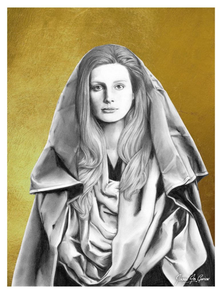 Graphite et fond acrylique doré sur papier satiné 300g/m² – l’oeuvre est encadrée